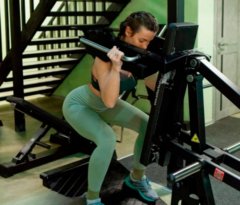 Принцип работы тренажера: приседания с обратным наклоном спиной или лицом к тренажеру.