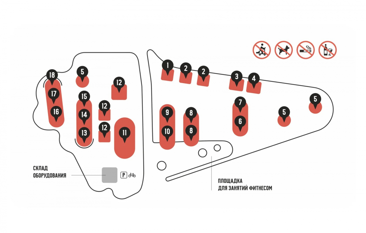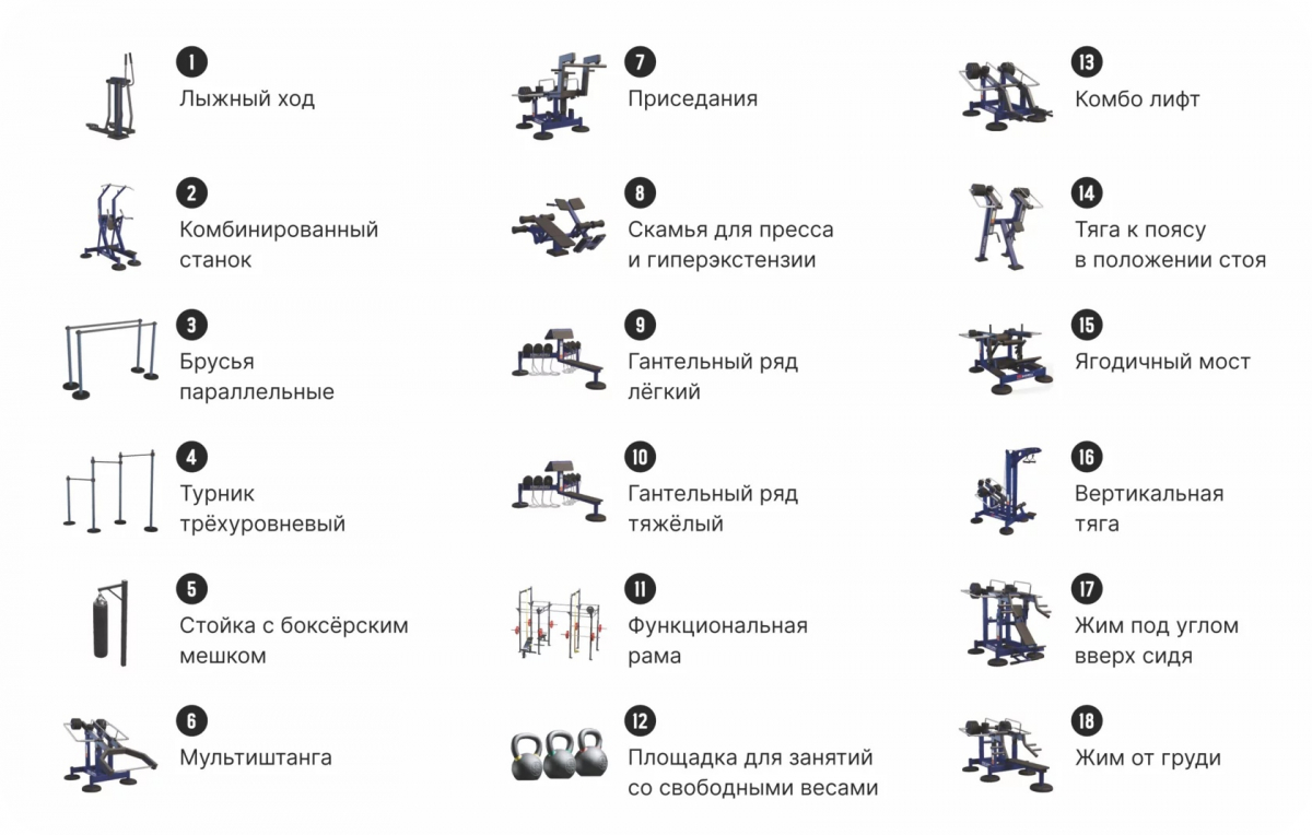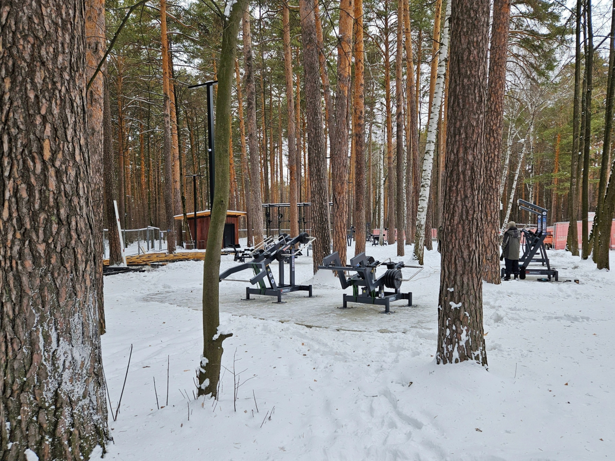 Тренажеры живописно разместились на территории, ведь благодаря грамотному проектированию при обустройстве площадки не спилено ни одного дерева. Тренировки теперь будут особенно полезными, наполненными ароматами соснового бора. По задумке архитектора все оборудование выполнено в нестандартном цветовом решении.