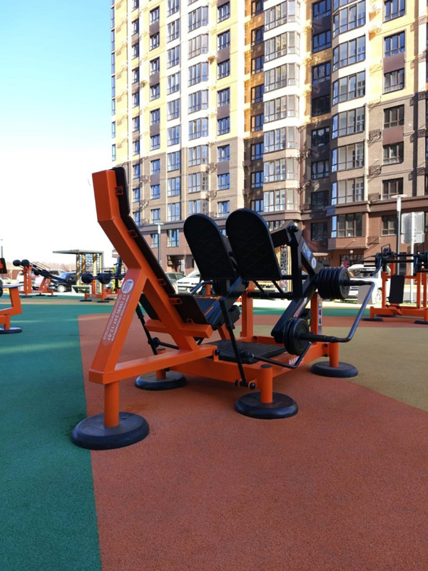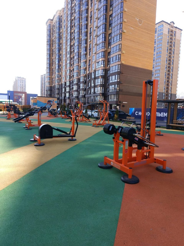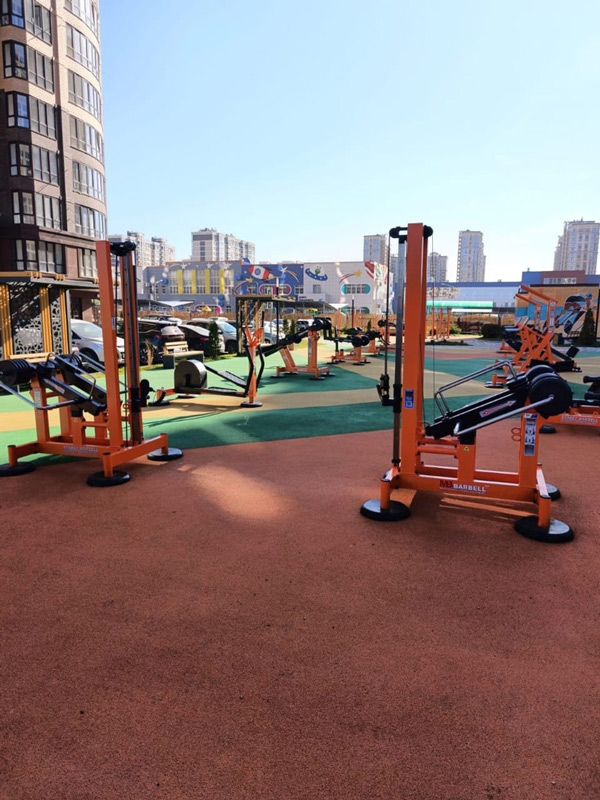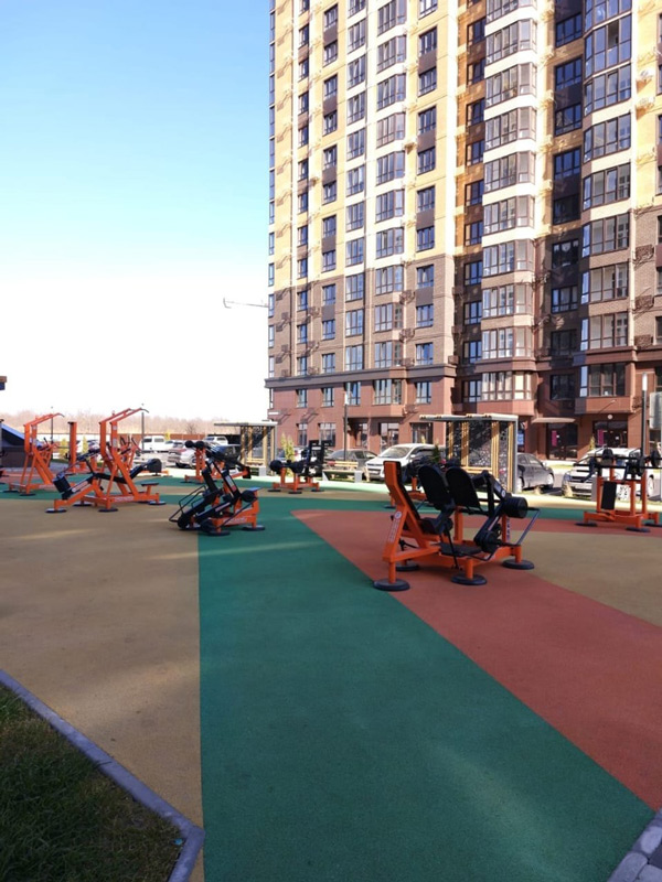 Крутую спортплощадку с великолепной тренажерной зоной получили от застройщика жильцы краснодарского ЖК «Достояние». Площадка расположена по адресу г. Краснодар, ул. им. Мурата Ахеджака, 10А. Такому набору оборудования позавидуют даже тренажерные залы. Здесь представлены тренажеры для всех базовых упражнений — всевозможные жимы и тяги, а также MB 7.100E КРОСОВЕР с изменяемой нагрузкой и регулировками высоты блока!