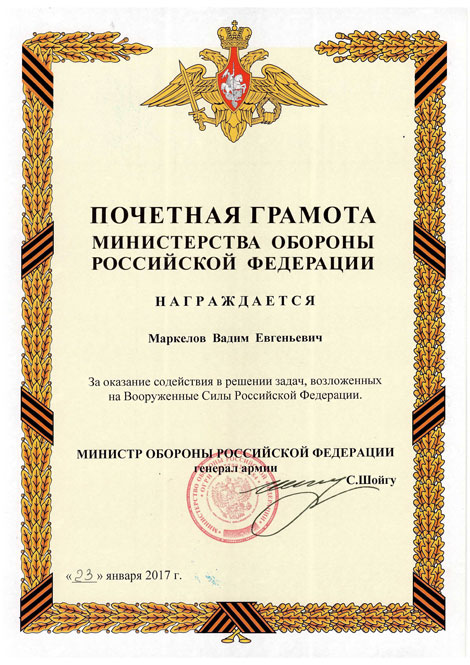 5 февраля представитель Министерства Обороны России лично вручил Вадиму Маркелову почетную грамоту Министерства обороны РФ за личной подписью Министра Сергея Шойгу. В копии приказа о награждении представлен список награжденных, в котором практически все представляют закрытые оборонные объекты, за исключением двоих — известного комментатора Дмитрия Губерниева и Вадима Маркелова.